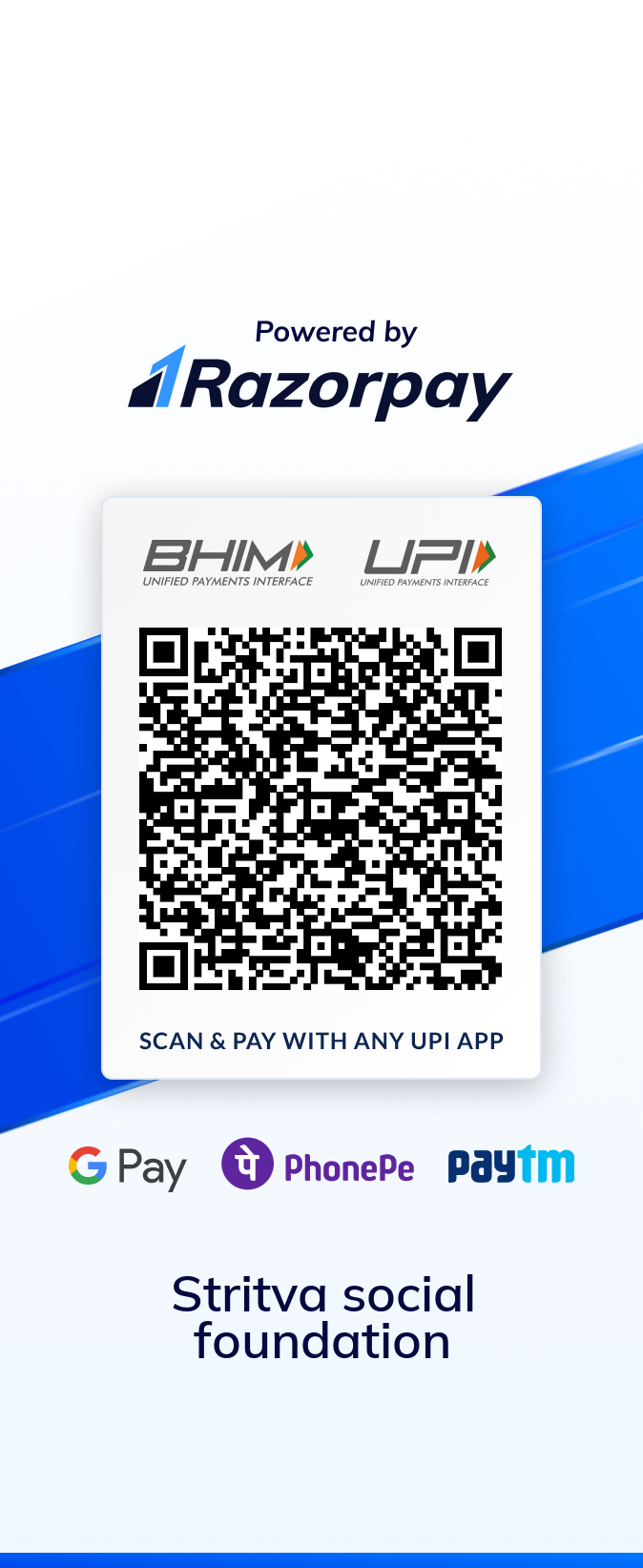 A/c Name - Stritva Social Foundation A/c No. 925010001663528 Ifsc code - UTIB0000228 Axis Bank Ltd. Shopping centre Kota branch.